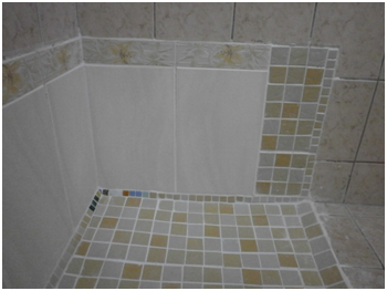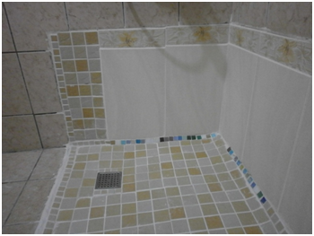圖2-1改造後之淋浴室,獨一無二的磁磚拼貼,選用原浴室磁磚之色系,採用腰身磁磚、光面壁磚(25x40)、4.8x4.8、2.4x2.4止滑馬賽克磁磚、1.2x1.2彩色玻璃馬賽克磁磚,以利餘邊之磁磚鋪設(不需要切割磁磚。