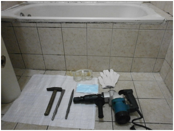 圖-3拆除工具,其中電動鎚H41,屬小型破碎機。因為第一次使用,前後花了3小時,我想熟練後,1個小時應該可以完工。