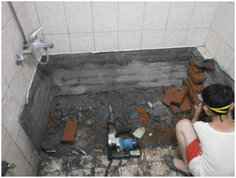 圖-8 但還需後續整地,包括右邊的磚牆、地面的水泥塊,未來要鋪設磁磚的地方,都要盡可能的平整。(為了方便工作,也拆了旁邊的洗手枱;待完工後,再安裝回去)