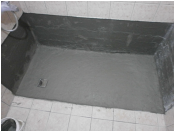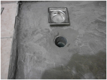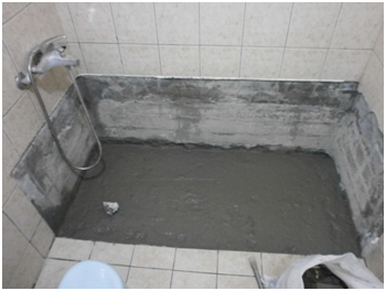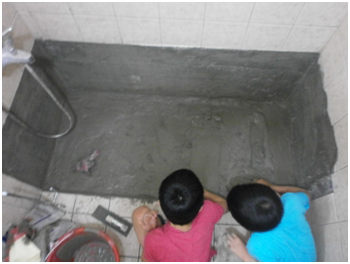 圖-13接下來做防水處理,在壁面塗刷「彈性水泥(彈泥)」(單液型纖維彈泥~已調製完成,有別於雙劑型彈泥)、地面先水泥沙打底,並大致拉出排水坡度;讓小孩們先玩一下泥做,我最後再調整。