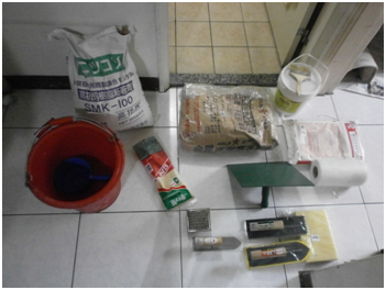 圖-12 工欲善其事,必先利其器,防水材料、泥做工具、水桶...等。