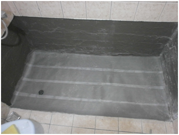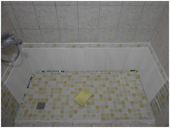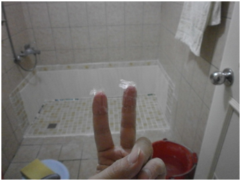 圖-23 電扇吹24小時後,用「磁磚填縫劑」塗抺在磁磚相連之間, 並用細海棉泡水擰乾,將磁磚上的填縫劑擦掉,直至磁磚上沒有水泥劑。最後,再電扇吹24小時後,新浴室就可以啓用。