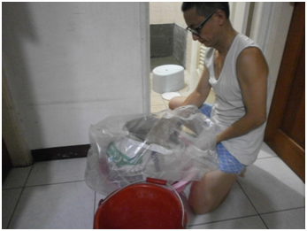圖-10 廢棄之水泥塊、磁磚、紅磚,用米袋(蛇皮袋)裝了10包,每包約20~30公斤(共約280公斤)。由於不可隨意棄置,網搜找到了「土石方資源堆置處理場查詢」之網址,撥打電話詢問後,終於找到願意收個人棄土的場所,於是自行清運至(中和區光環路二段3XX號),棄土場老板收了300元安置費。