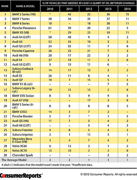 在2015年6月30日美國Consumer Reports消費者報告(http://www.consumerreports.org/cro/magazine/2015/06/excessive-oil-consumption/index.htm)發表2014年度汽車消費者問卷調查中表示:Audi、BMW、Subaru汽車製造廠所生產的汽車引擎,在下次保養週期前,需要自行補充機油的比例偏高,並認為「過量的消耗機油」是不正常的;對於車廠表示在保養週期屆滿前需要自行補充機油,是車主(消費者)所不能接受的。