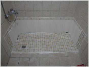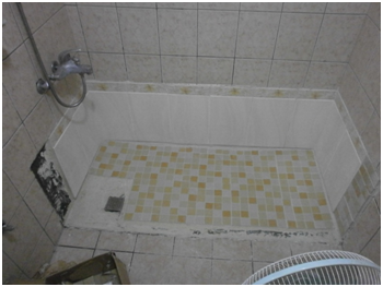 圖-23 電扇吹24小時後,用「磁磚填縫劑」塗抺在磁磚相連之間, 並用細海棉泡水擰乾,將磁磚上的填縫劑擦掉,直至磁磚上沒有水泥劑。最後,再電扇吹24小時後,新浴室就可以啓用。