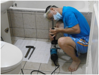 圖18 使用手持式切割機+鑽石切片(注意安全,面罩、口罩不可少,將舊磁磚切割平整。切割時,灰塵超多,比之前破壞磚體有過之,而無不及;小撇步:請家人拿吸塵器,放在在切割處之揚塵處,可以大大減少揚塵。