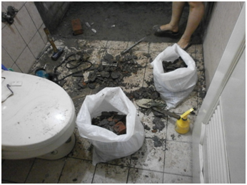 圖-8 但還需後續整地,包括右邊的磚牆、地面的水泥塊,未來要鋪設磁磚的地方,都要盡可能的平整。(為了方便工作,也拆了旁邊的洗手枱;待完工後,再安裝回去)