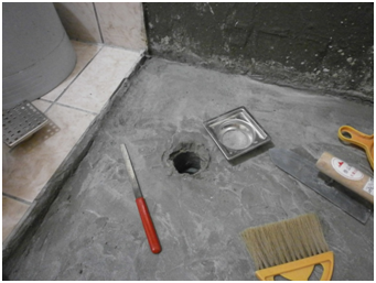 圖-13接下來做防水處理,在壁面塗刷「彈性水泥(彈泥)」(單液型纖維彈泥已調製完成,有別於雙劑型彈泥)、地面先水泥沙打底,並大致拉出排水坡度;讓小孩們先玩一下泥做,我最後再調整。