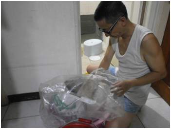 圖-10 廢棄之水泥塊、磁磚、紅磚,用米袋(蛇皮袋)裝了10包,每包約2030公斤(共約280公斤)。由於不可隨意棄置,網搜找到了「土石方資源堆置處理場查詢」之網址,撥打電話詢問後,終於找到願意收個人棄土的場所,於是自行清運至(中和區光環路二段3XX號),棄土場老板收了300元安置費。